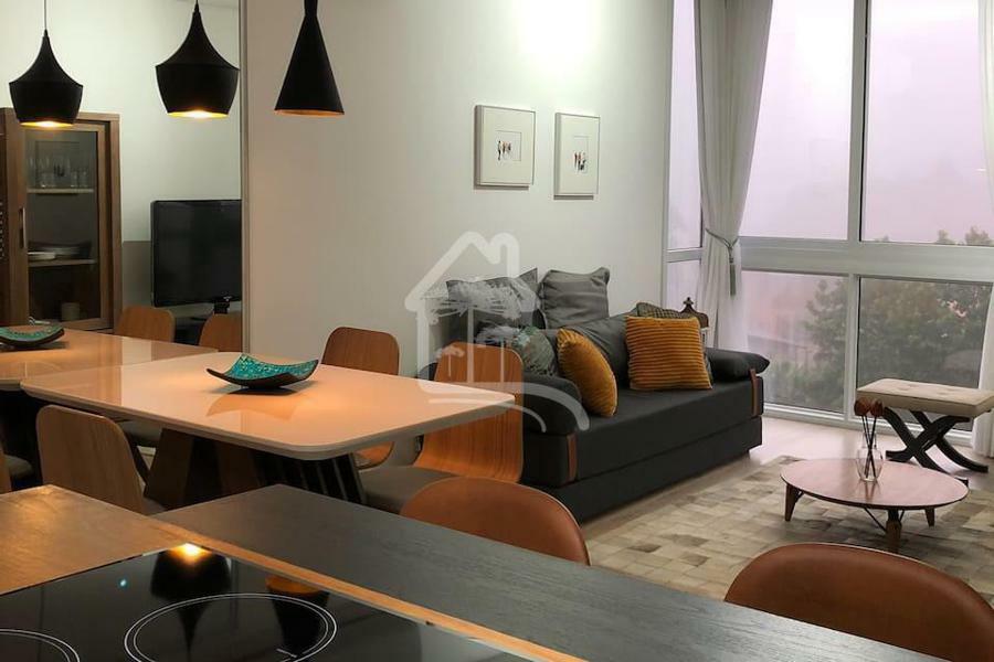 Mobiliado, o apartamento conta com um dormitório, banho social, sala com dois ambientes, cozinha equipada com churrasqueira, área de serviço e uma vaga de garagem.