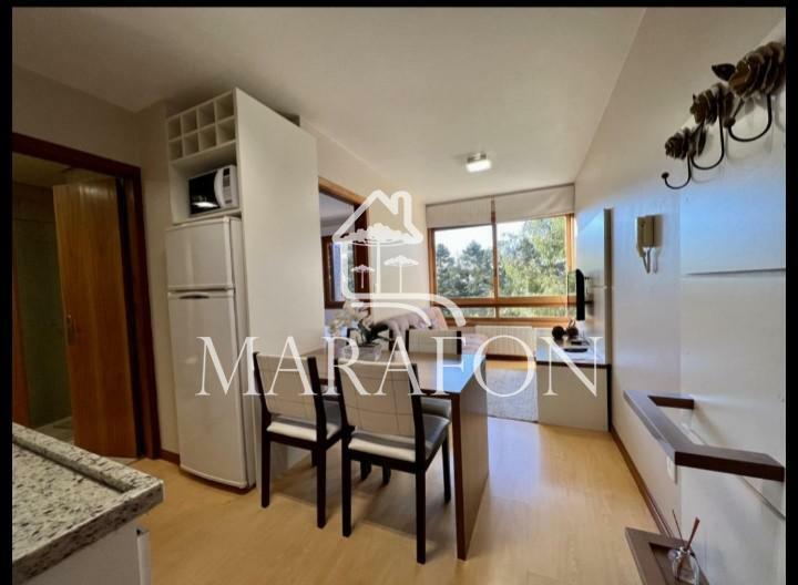 Apartamento mobiliado de um dormitório, banho social, cozinha integrada, sala de estar e sala de jantar integradas, calefação, persiana e uma vaga de garagem.