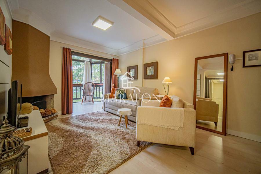 Apartamento mobiliado conta com um dormitório, banho social, sala de estar com lareira, sacada integrada, sala de jantar, cozinha e uma vaga de garagem. Este imóvel é a combinação perfeita entre conforto, praticidade e localização privilegiada. Não perca a oportunidade de viver em Gramado com todo o charme e conforto que você merece!
