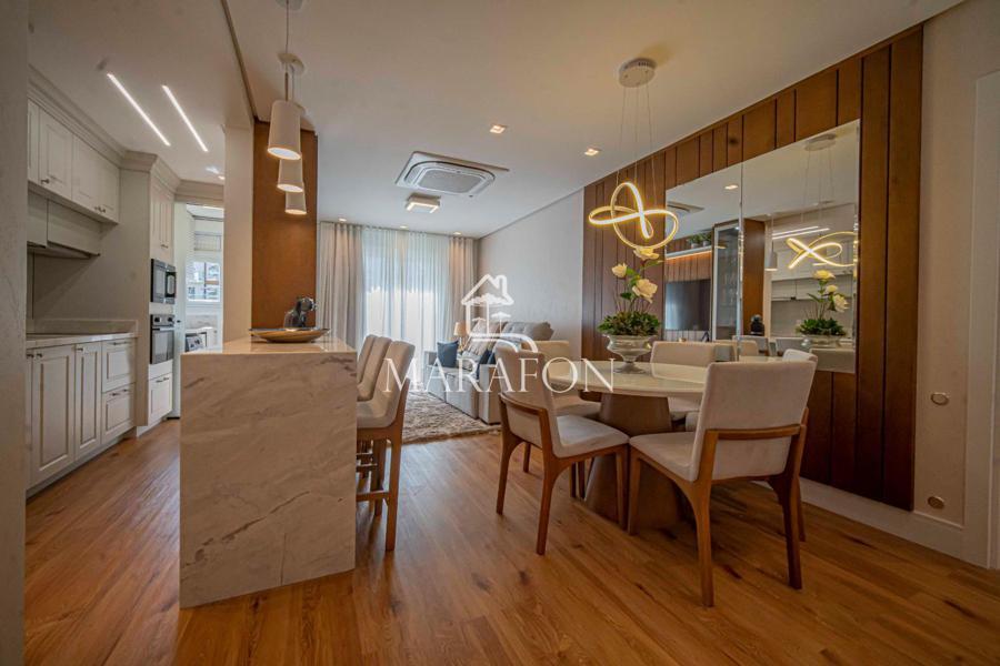 Ótimo aparamento à venda em Gramado, de uma suíte, lavabo, cozinha com churrasqueira, área de serviço, esperas para lareira, ar condicionado, água quente e calefação, piso vinilíco, esquadrias em pvc com vidro duplo e uma vaga de garagem.