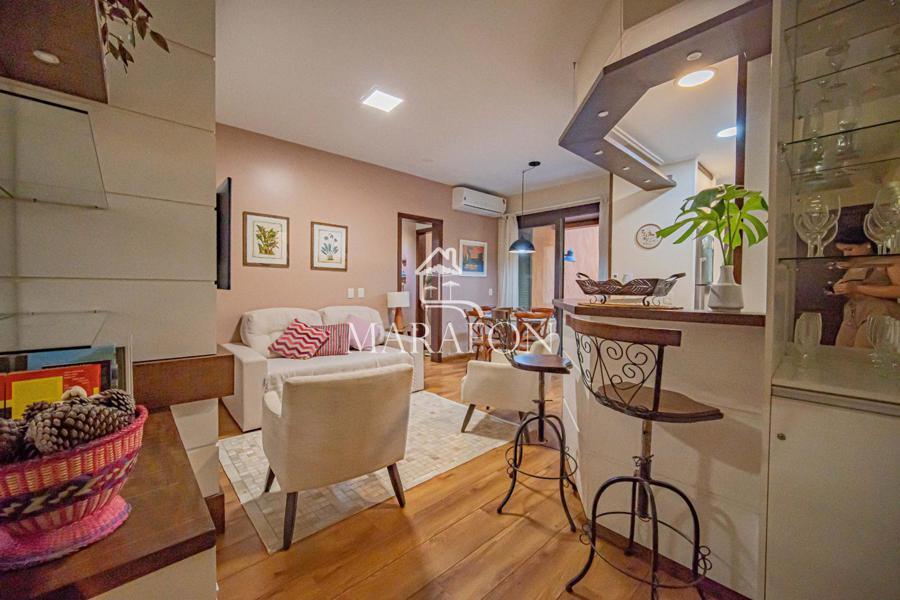 O imóvel é mobiliado e oferece dois dormitórios, sendo uma suíte e um dormitório com acesso a um terraço exclusivo. O apartamento ainda conta com sala de estar com lareira, sala de jantar, cozinha americana com churrasqueira, área de serviço, banho social e uma vaga de garagem.