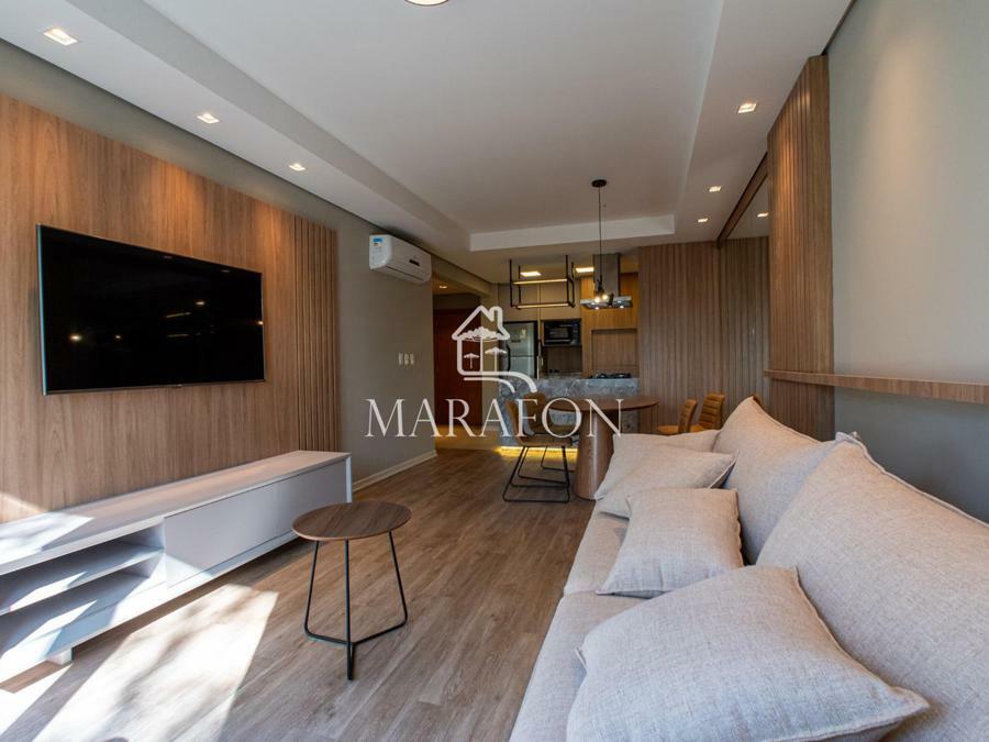 Apartamento mobiliado com duas suítes, lavabo, living dois ambientes com espera para lareira, cozinha com churrasqueira, área de serviço, espera para calefação, água quente, automação e splits, garagem coberta.