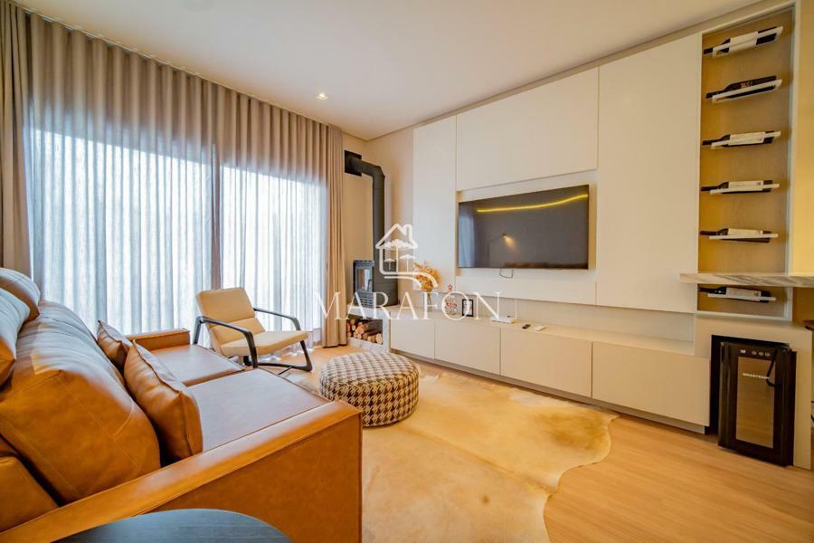 Excelente apartamento à venda em Gramado, todo mobiliado com duas suítes, lavabo, cozinha com churrasqueira, living dois ambientes com lareira, sacada, slits instalados, água quente e uma vaga de garagem.