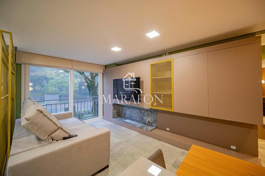 Excelente apartamento à venda em Gramado, mobiliado e decorado de duas suítes, lavabo, sala de estar e sala de jantar integradas com lareira, cozinha integrada com churrasqueira, ar condicionado instalado, área de serviço, espera para calefação e uma vaga de garagem.