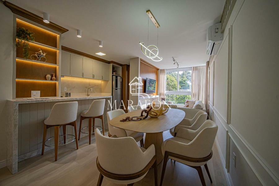 Belíssimo apartamento à venda em Gramado, de duas suítes, lavabo, área de serviço, sala de estar, sala de jantar, cozinha, churrasqueira, esperas para calefação e splits, rebaixamento em gesso, piso aquecido nos banheiros, medidores de água, luz e gás individuais, piso laminado e uma vaga de garagem.