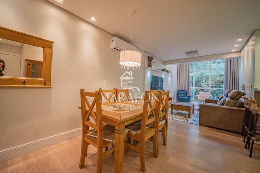 Lindo apartamento à venda em Gramado, totalmente mobiliado e decorado, com duas suítes, living dois ambientes lareira, sacada integrada voltada para o verde, lavabo, cozinha americana com churrasqueira, área de serviço, uma vaga de garagem sendo ela dupla. Condomínio com salão de festas, espaço gourmet, espaço fitness equipado, com piscina aquecida e hidromassagem, quatro elevadores com biometria e senha, pista para caminhada em área de vegetação preservada e projeto paisagístico.