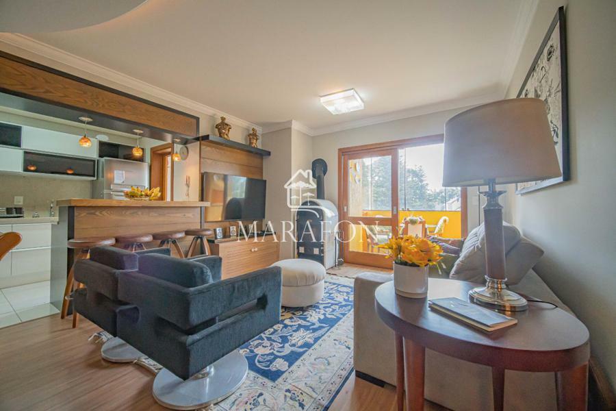 Lindo apartamento à venda em Gramado, todo mobiliado e decorado com três dormitórios, (sendo uma suíte), cozinha americana, living dois ambiente, sacada com churrasqueira, área de serviço, excelente posição solar, uma vaga de garagem dupla, calefação e água quente instalados.