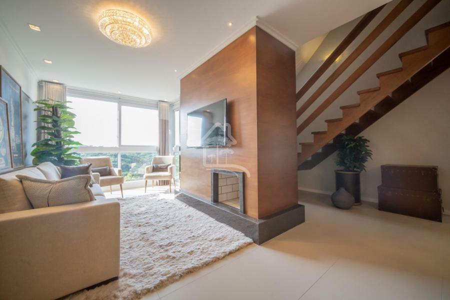 Cobertura mobiliada, conta com três dormitórios sendo duas suítes, banho social, sala de jantar, sala de estar com lareira, cozinha com churrasqueira e área de serviço. Com espera para calefação, forro em gesso, esquadrias externas em PVC, piso porcelanato e vinílico.
