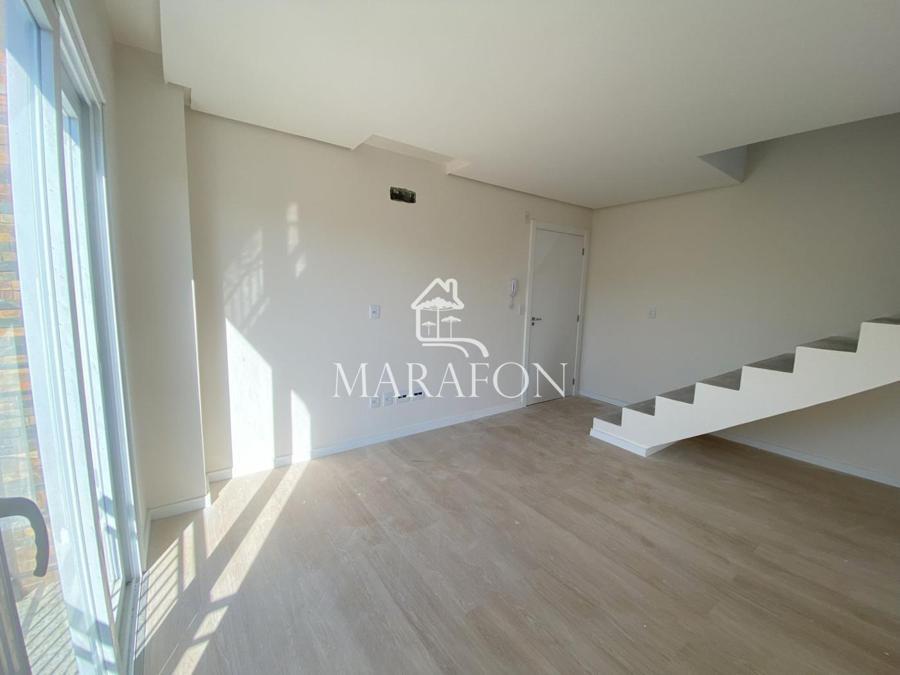 Apartamento na cobertura, conta com três suítes, cozinha integrada com living, churrasqueira, espera para lareira, lavabo, lavanderia, espera para calefação, água quente e splits, uma vaga de garagem, esquadrias em PVC, rebaixamento em gesso, piso laminado e porcelanato.