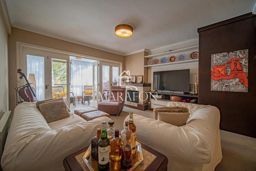 O imóvel é semimobiliado e conta com três dormitórios, sendo uma suíte, banheiro social, sala de estar com lareira, sala de jantar, lavabo, cozinha com churrasqueira, sacada fechada e uma vaga de garagem coberta.