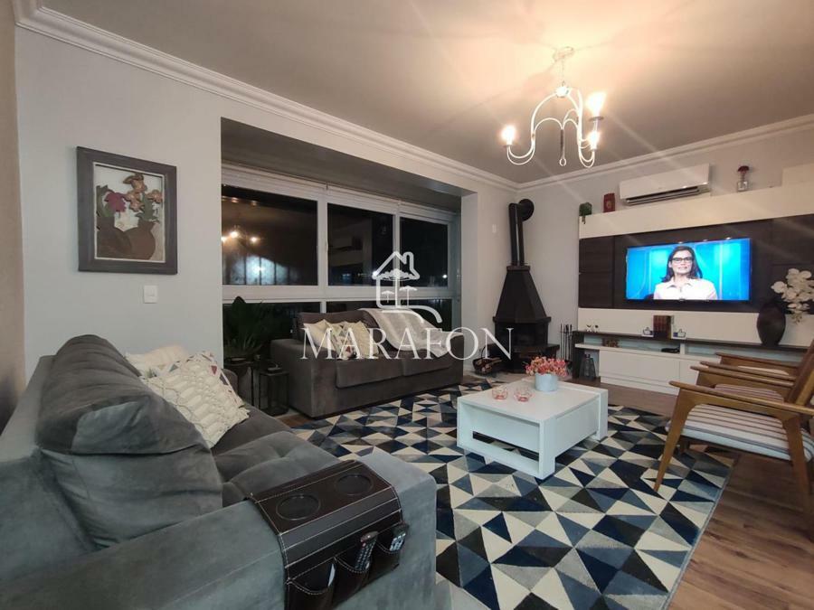 Apartamento conta com três dormitórios sendo uma suíte, banho social, lavabo, living dois ambientes com lareira, cozinha com churrasqueira, água quente, espera para split, área de serviço e uma vaga de garagem.