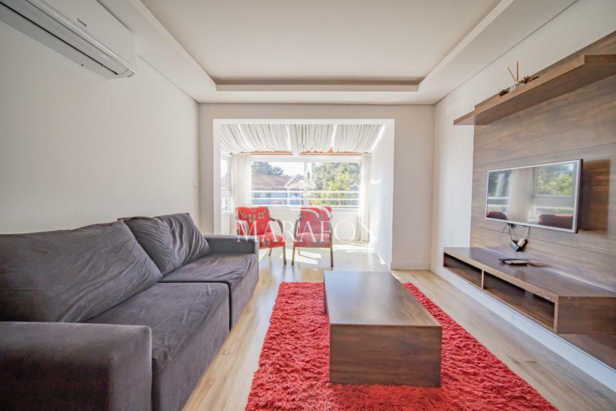 Apartamento mobiliado com três suítes, lavabo, living dois ambientes com sacada fechada, cozinha integrada com churrasqueira, área de serviço, água quente, espera para lareira, calefação e splits, três vagas de garagem.