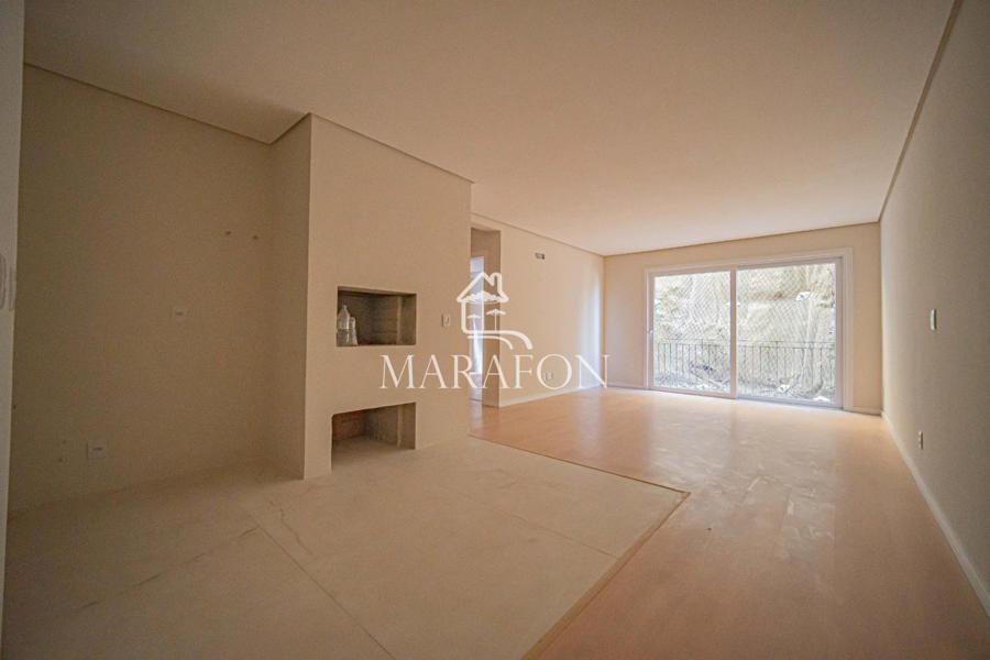 Apartamento à venda em Gramado, com três dormitórios, sendo uma suíte, banheiro social, living dois ambientes, cozinha com churrasqueira, área de serviço, uma vaga de garagem, espera para lareira e splits, aquecimento de água e esquadrias de PVC.