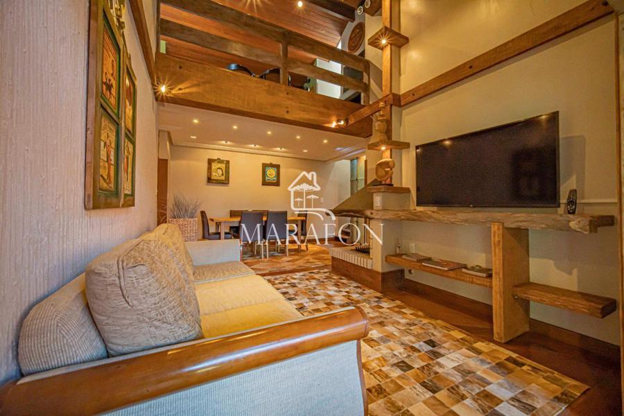 Apartamento duplex com cinco dormitórios sendo uma suíte, banho social, living dois ambientes com lareira, ampla sacada fechada, cozinha, área de serviço separada, espaço gourmet com lareira e churrasqueira, quatro vagas de garagem e amplo terraço com vista para a Aldeia do Papai Noel, um dos pontos turísticos mais procurados de Gramado.