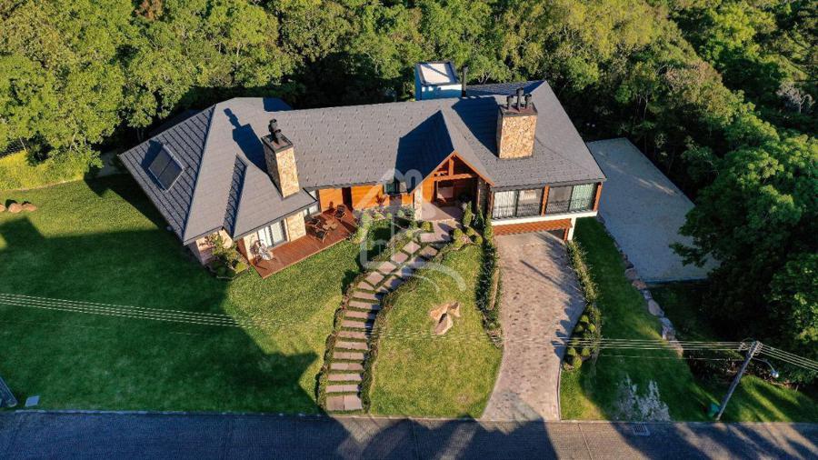 A residencia conta com três suítes, sendo duas master, possui ambientes amplos e acolhedores, incluindo um living sala de estar com lareira, sala de jantar e cozinha equipada com ilha. A casa conta ainda com dois lavabos, um espaço gourmet com churrasqueira, sala de cinema, sala de jogos, adega subterrânea, deck externo com lareira e garagem com capacidade para até quatro carros.