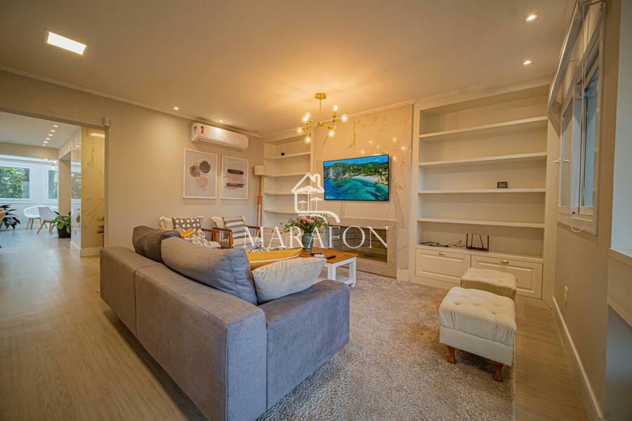 O imóvel conta com quatro suítes, incluindo uma suíte térrea e uma ampla suíte master. Os ambientes sociais são espaçosos e bem integrados, compostos por sala de estar com lareira, sala de jantar, solarium com hidromassagem, cozinha com ilha e churrasqueira, lavanderia, lavabo, banheiro social e garagem coberta para dois veículos.
